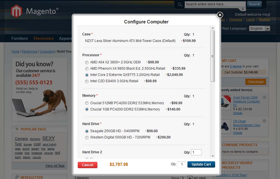Adding Products to CartUsual ways to add products to the cart are used. When Add to Cart button is pressed - there is a modular window where customers can choose options and set the quantity.