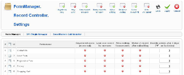 Usage - RecordsAfter the Record Controller is installed – please set it to suit your needs. To set and use it please Open the main page of SFG (Components –> Smart Former Gold -> Form Manager). In the top bar you will see the additional button RecordControl.
